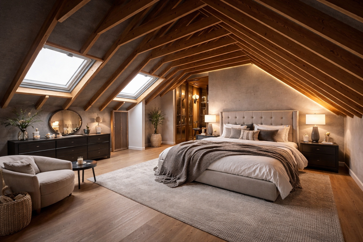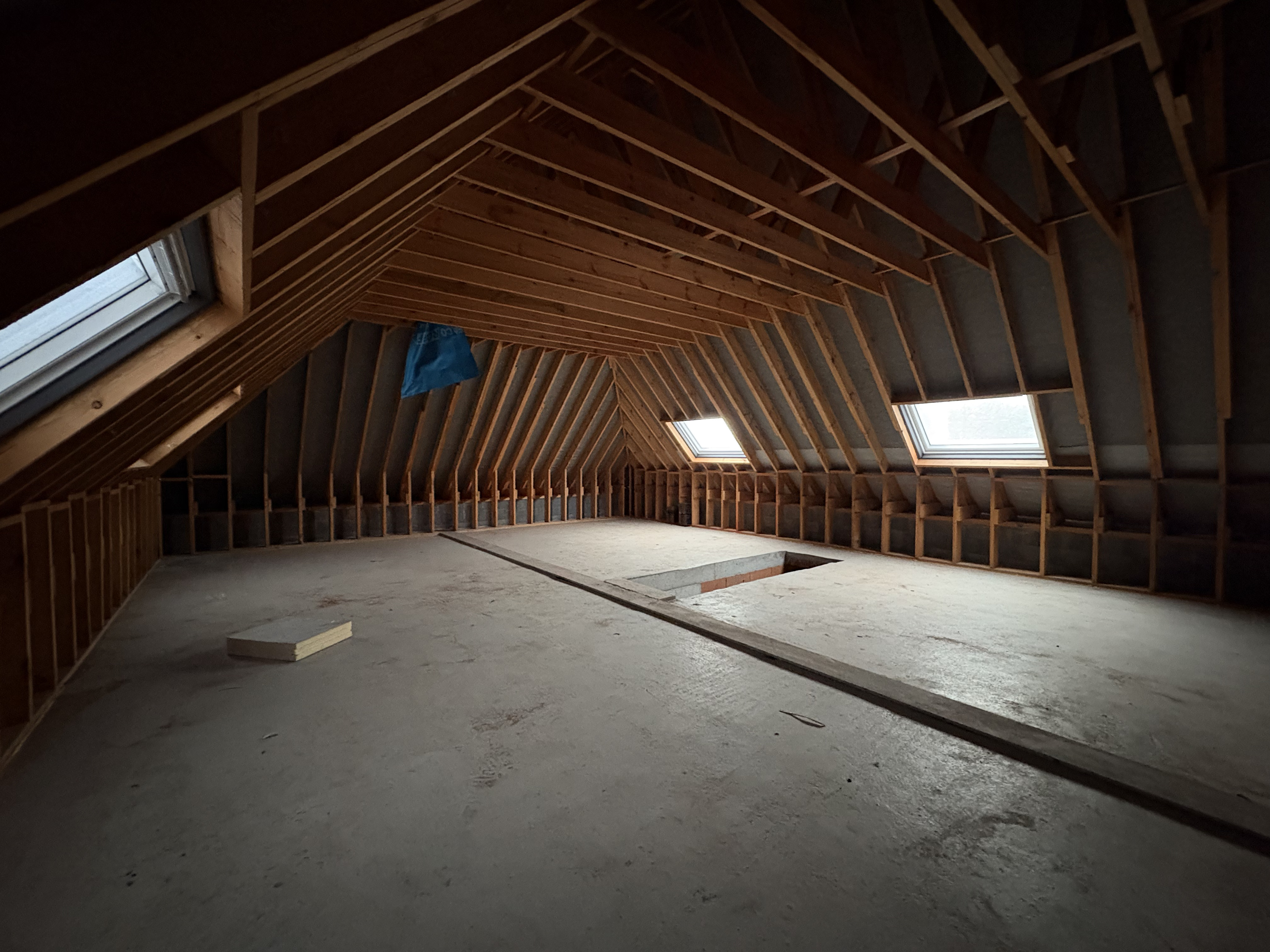 2e étage : Accès via escalier en béton, grand grenier aménageable de 80m² pouvant accueilir 4 chambres supplémentaires.